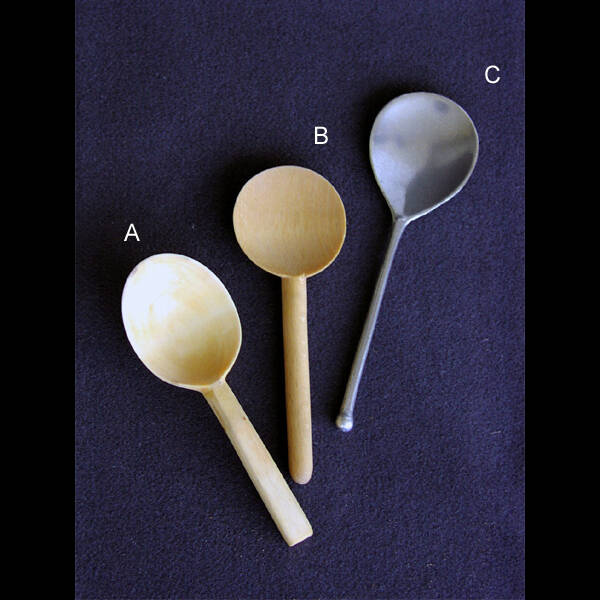 Löffel, Holz (A+B), Zinn (C)